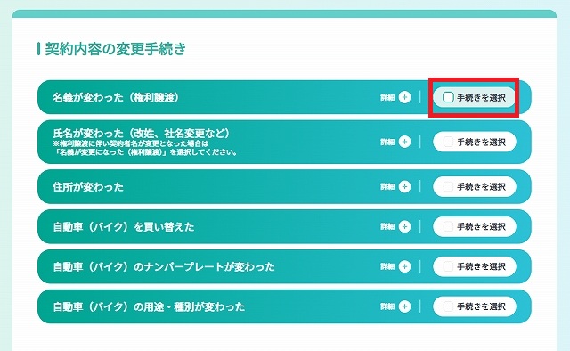 「名義が変わった(権利譲渡)」の【手続きを選択】をチェックして、画面を下にスクロールします。