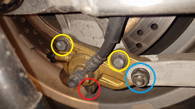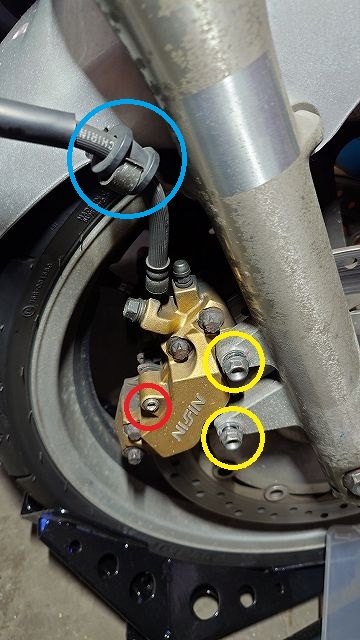 青丸のブレーキホースを金具から外して、赤丸はパッドピンプラグを外して、パッドピンを緩めてから、黄丸のキャリパーボルトを外します。