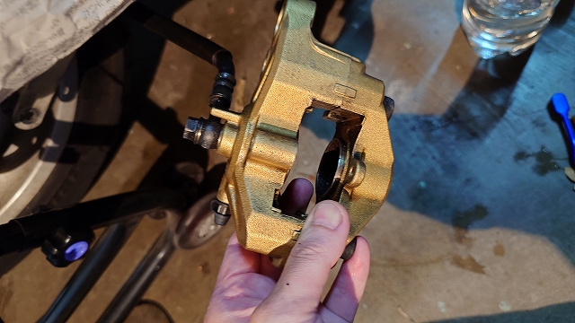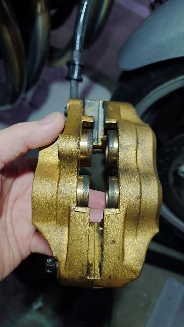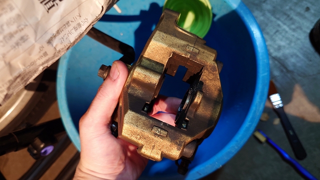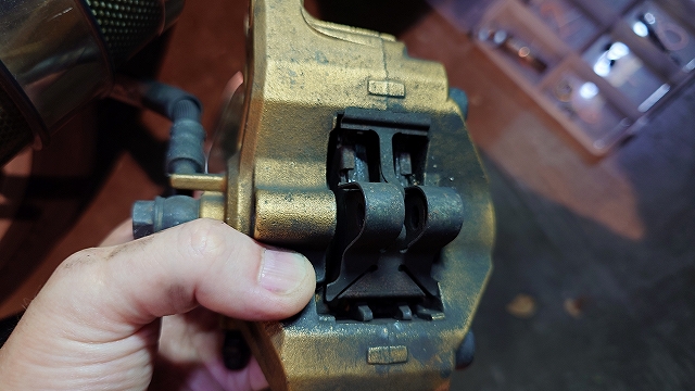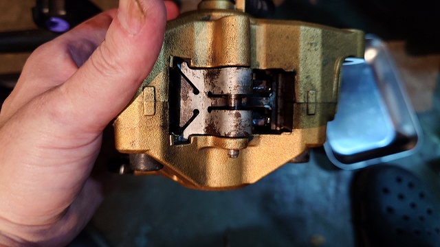 抜きづらい時は、少しだけキャリパー本体を奥に押したり、手前に引いたりすると、隙間ができて抜きやすくなります。ピストンシールを傷める可能性があるので、少しずつですよ。