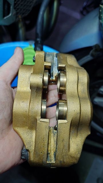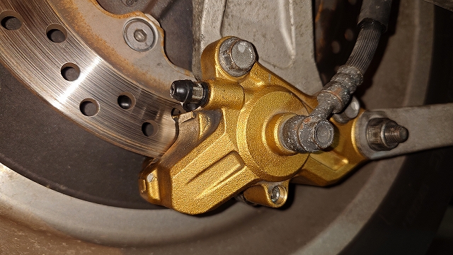 フロントキャリパーから始めます。ぱっと見はきれいですが、ピストンなどはどうなっているでしょうか。