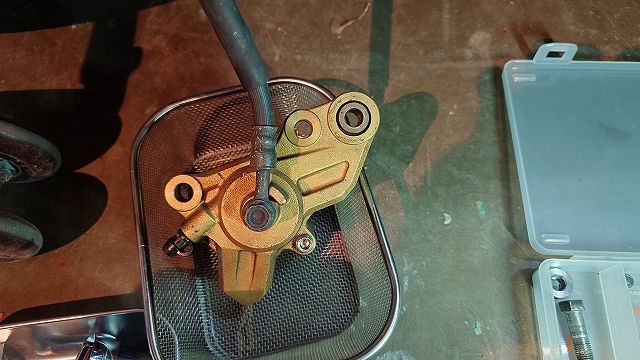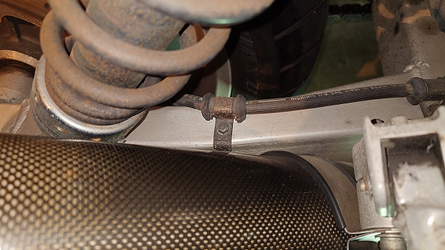 リアブレーキホースクランプは外した方が、キャリパーの自由度が上がります。