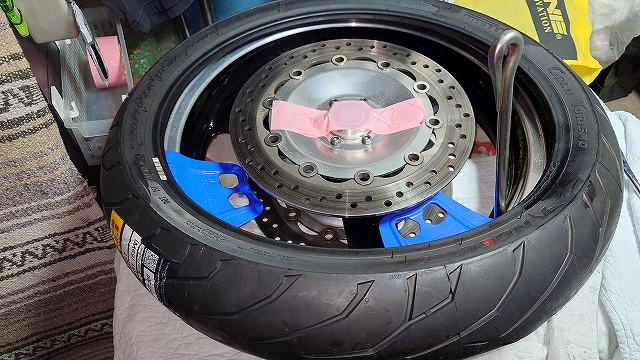 古いリアタイヤを一番下に敷いて、その上に新しいリアタイヤ、そしてリアホイールを置いて作業します。