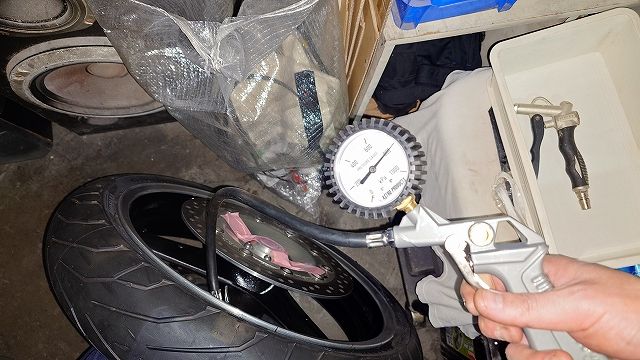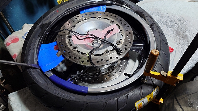 練習がてら旧リアホイールからリアタイヤを外します。古いリアタイヤは作業台にしようかと思います。