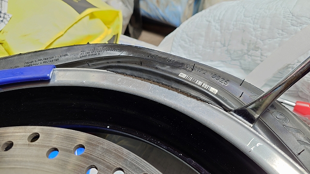 リムガードが入らず、タイヤレバーが直接ホイールに当たってます。手前のガリキズは見なかったことにしたい。ここまでくれば後は放っておいてもハマるかもしれません。