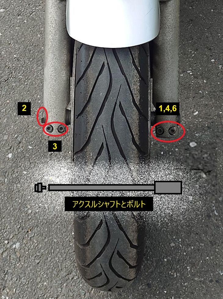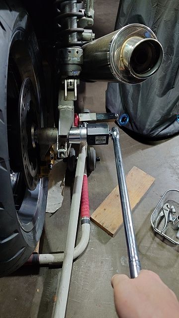 1.リアキャリパー外す、アクスルシャフト抜く、チェーン戻す、アクスル入れる、リアキャリパー付ける